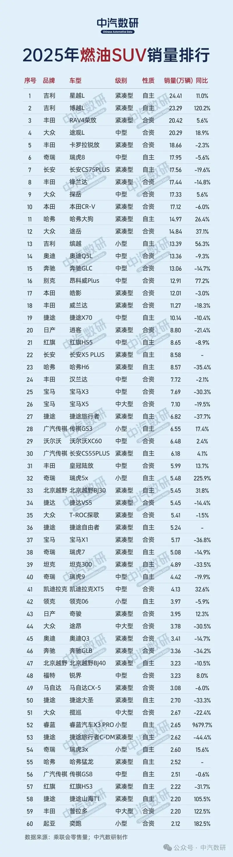 吉利旗下的两款车型——星越L(24.41万辆)、博越L(23.29万辆)包揽燃油SUV冠亚军,其中博越L同比大增120.2%,紧凑级SUV的智能化、年轻化适配精准击中市场需求;