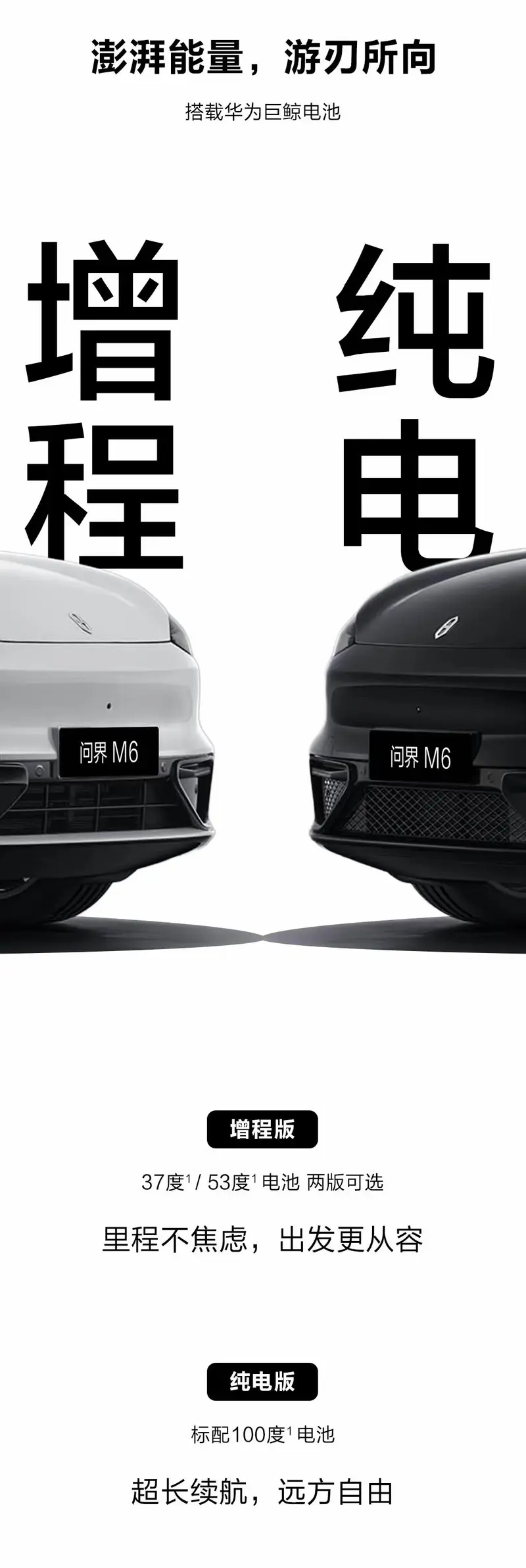 特斯拉Model Y(26.39万起)之间。对于在纯电和增程之间犹豫的用户,问界M6提供了纯电选项;对于看重续航和智驾的用户,其配置更为全面。
