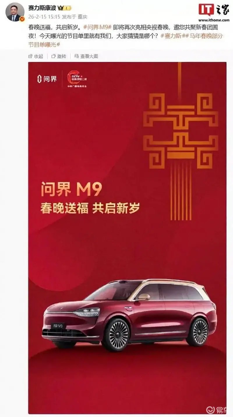 鸿蒙智行问界M9汽车即将第三次亮相央视春晚舞台,这一消息由赛力斯集团副总裁康波正式公布。根据已公开的春晚节目单,问界M9的登场引发了广泛关注。
